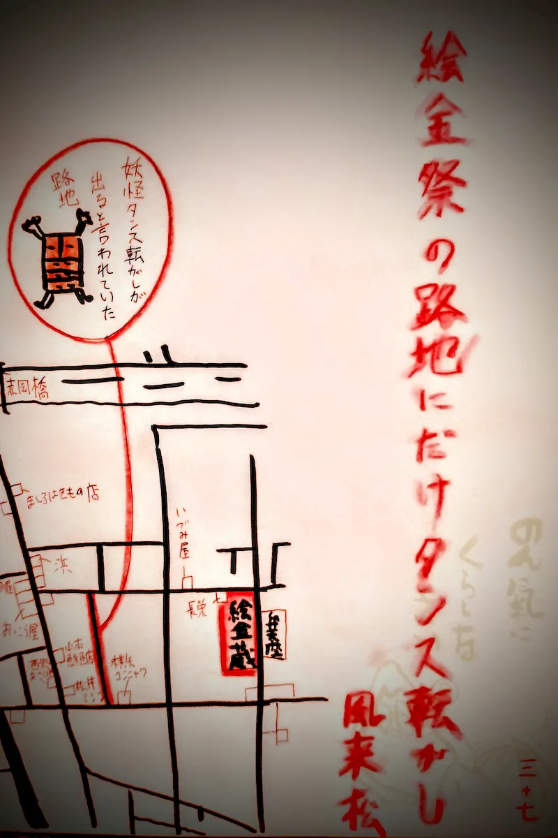赤岡は、幕末の浮世絵師・血みどろ絵金こと、弘瀬金蔵で有名な土地である。彼の門人には、河田小龍や、武市瑞山もいる。その赤岡の、〈絵金蔵〉のすぐ裏の路地に、タンス転がしが現れるという。描いた地図は、現地で貰った〈町歩きマップ〉。初めて知ったこの妖怪を、図書館や、ネットで調べ、人にも聞いて回っているのだが、全く手がかりがない...。