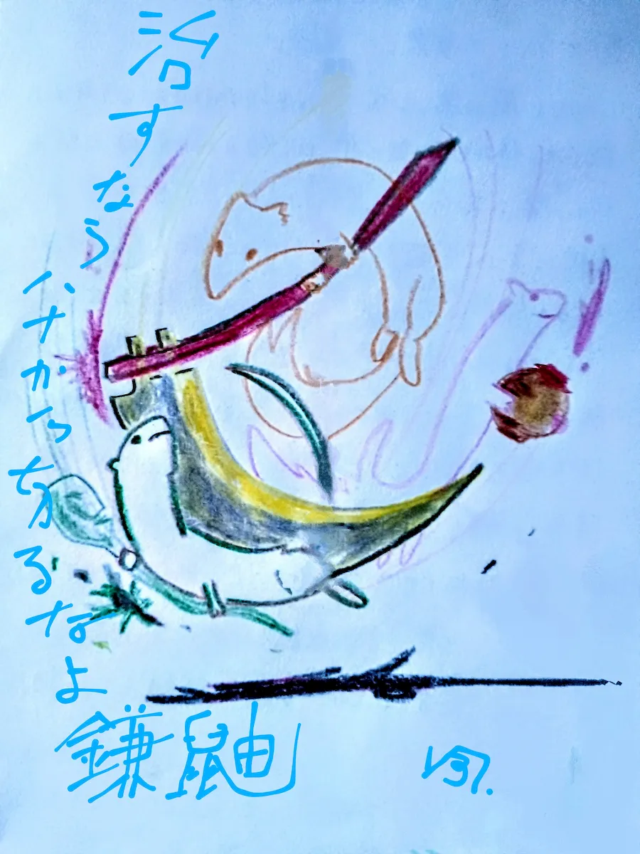 野鎌・鎌風・悪禅師の風・羊角風...とも。旋風に乗って、人を斬ったり生き血を吸う。ただ、その傷は出血も痛みも無いという。とくに甲信越に多く伝わり、越後七不思議の一つ。鼬だけでなく、悪霊、神の仕業とも。