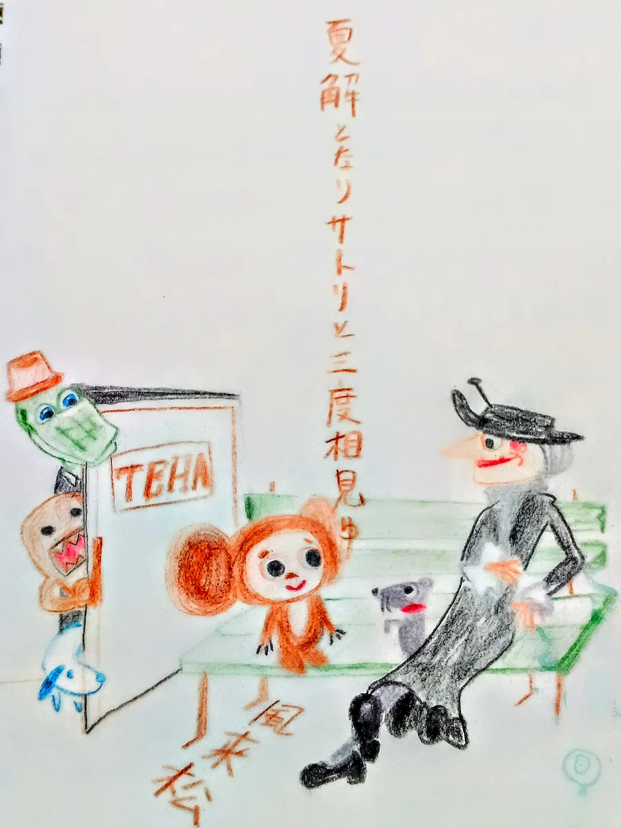 描いたのは、猿ぽく、どこか覚ぽくもあるロシアのチェブラーシカ。自分でも正体は分からないらしいが恐らく南の島の猿? 横で見ているどーもくんの方も妖怪や妖精ではなく、恐竜時代の生き残りらしい!
