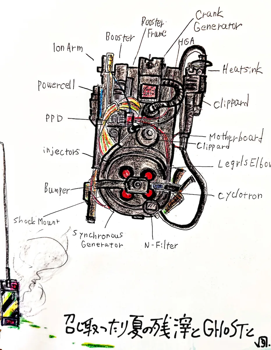 描いたのは、ご存知『ゴーストバスターズ』のプロトンパック!これで、アグリーリトルスパットも、マシュマロマンも、破壊の神ゴーザも退治した。そして現代、イゴン・スペングラー博士の孫娘が、ゴーストバスターズを復活して大活躍中だ!