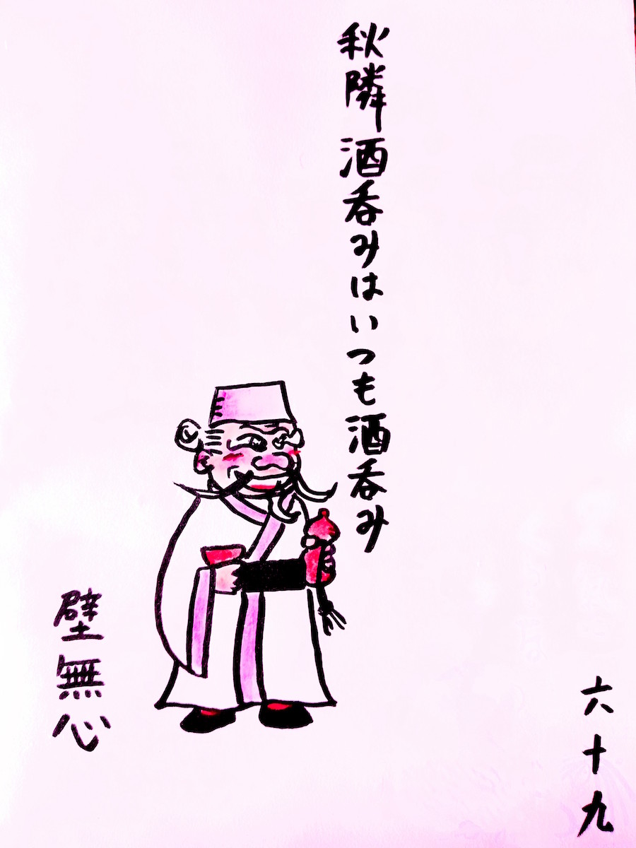 この句の俳人・壁無心も、もちろん酒呑みというか、酒を愛する人物。筆者が寄らせて(酔わせて)もらってる居酒屋〈ホヤケン〉で出会った。この俳画集も、その〈ホヤケン〉で開催されている〈ハイミー句会〉から生まれた。