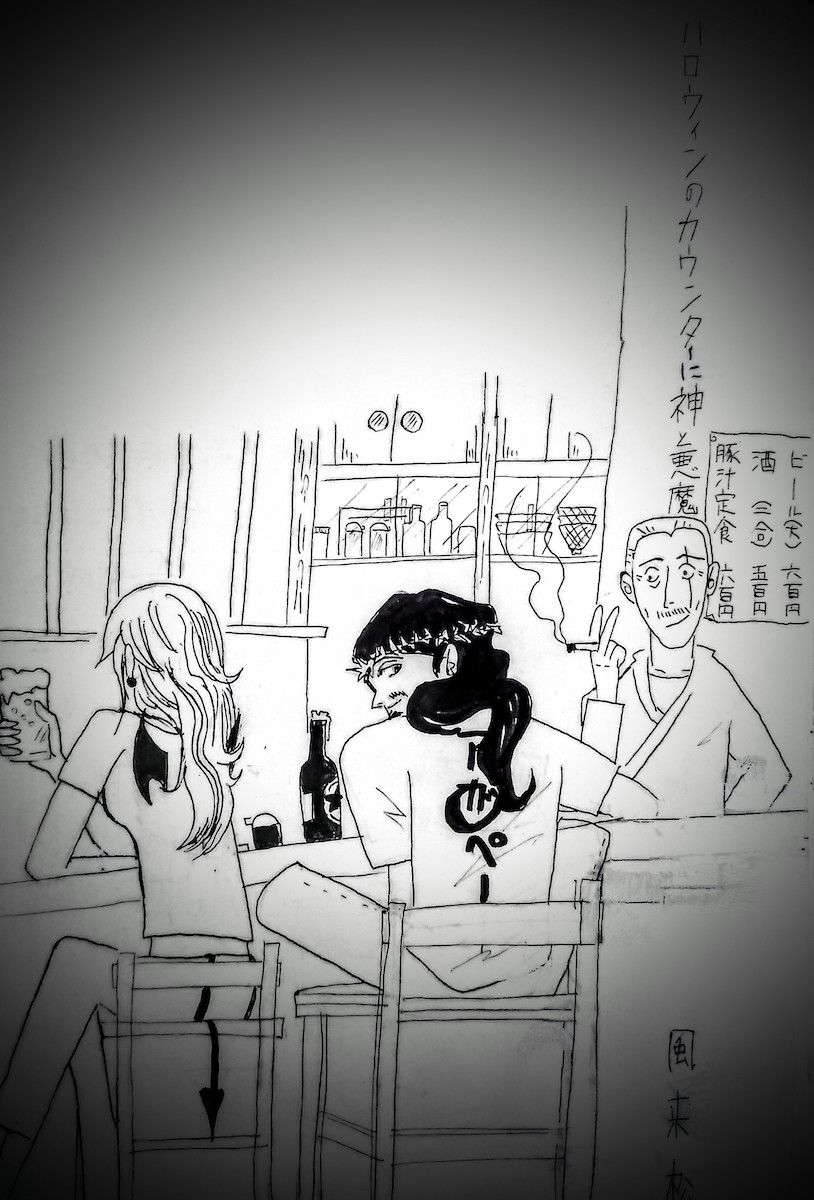 描いたのは、〈ハロウィン〉に、『深夜食堂』の〈めしや〉を訪れた、『ワンピース』のナミと『聖☆おにいさん』のイエス。
