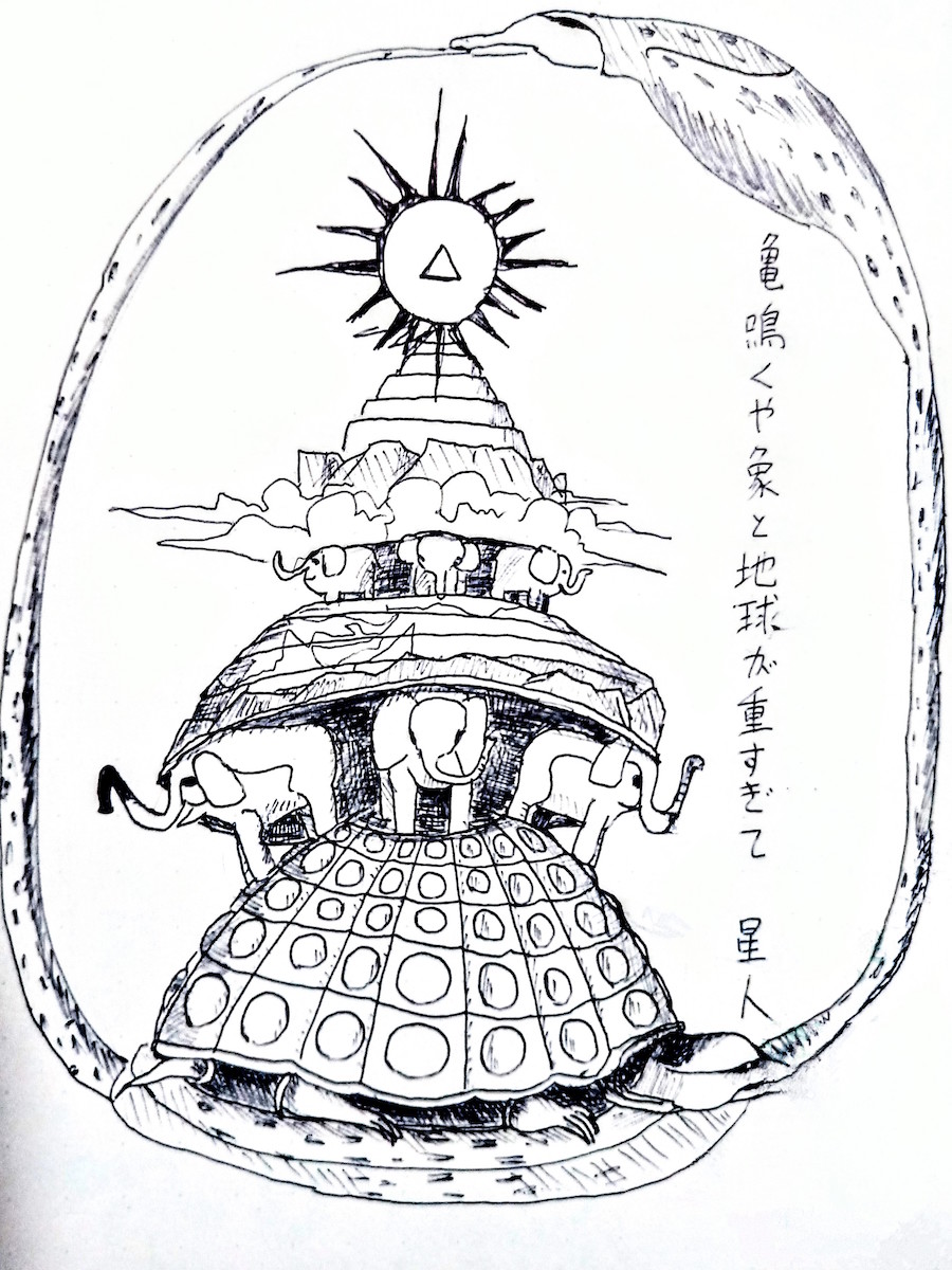 おそらく、仏教の宇宙観の元となったのがインド・バラモン教。地・空気・天からなる9層で、ブラフマーが有頂天に住む。また、世界は巨大亀アクバーラの背に乗った象に支えられ、大蛇に囲まれている。これが、絵に描いた図。イスラム世界の大地の下に巨牛クューター、その下に巨魚バハムート、さらにその下に海があり、巨大蛇ファラクがいる構図に似ている。