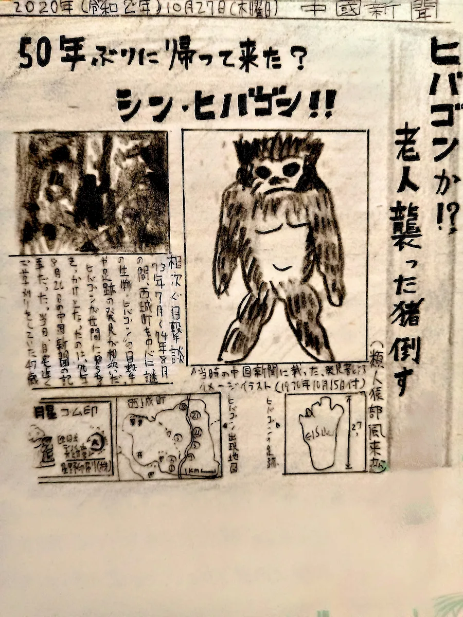 同年10月11日が最後の目撃例となり(最終的には約100件!)、明けて1975年ヒバゴン騒動終息宣言が出された...。ただ、その翌年タクシー運転手による目撃、80年には比婆山中で正体不明の霊長類のような大型動物の半分白骨化した死体が発見された! その年、福山市山野町田原で目撃や、足跡の発見もあり、こちらはヤマゴンと呼ばれた。その後、久井町にもクイゴンが...。