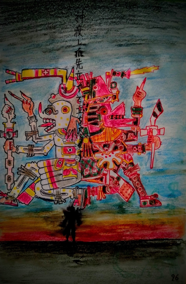 描いたのはアステカの二神、ケツァルコアトルと、テスカトリポカ。前者は「羽毛のある蛇」の意で、最大級の翼竜の名でも知られる。古くは農耕神、風の神だったが、後に人に文明を授けた文化神とされた。平和の神ともされ、人身御供を止めさせた。この事で怒ったのがテスカトリポカ(こちらも最近直木賞を取った小説の題名に)。戦い、敵、夜、魔術、美の神で、ケツァルコアトルに呪いの酒プルケを飲ませ妹と交わらせて、追放してしまった。が、後にキリスト教宣教師たちに悪魔とされた。一説には1591年コルテスがメキシコに侵略してきた際、人々はケツァルコアトルが復活した姿だと間違え、滅亡につながったとも言われる...。そんな、二神の前で立ち尽くすのは、マンガ『ベンセルク』のタフな主人公ガッツ。