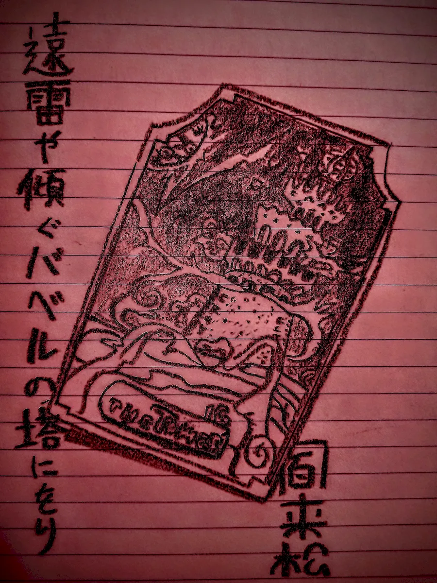 絵に描いたのはバベルの塔がモチーフだとされる、〈タロットカード〉の中でも「最悪」の「ザ・タワーXIII」。人間の驕りに対する天罰を表す。
