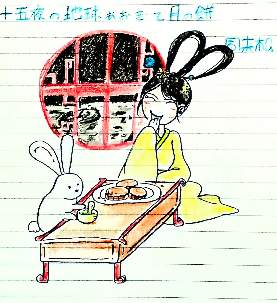 絵に描いたのは、嫦娥と玉兎が、月見ならぬ地球見をしながら、月餅を食べているところ。この中国のお月見の定番菓子は、古代から中秋節の供え物だった。また、朱元璋がこれに手紙を隠し元への反乱の合図としたり、清への反乱の際にも使われたという。日本では、1927年、〈中村屋〉が販売を始めた。チャンドラ・ボースのカレーパンの!何かと、革命に縁のある菓子らしい。