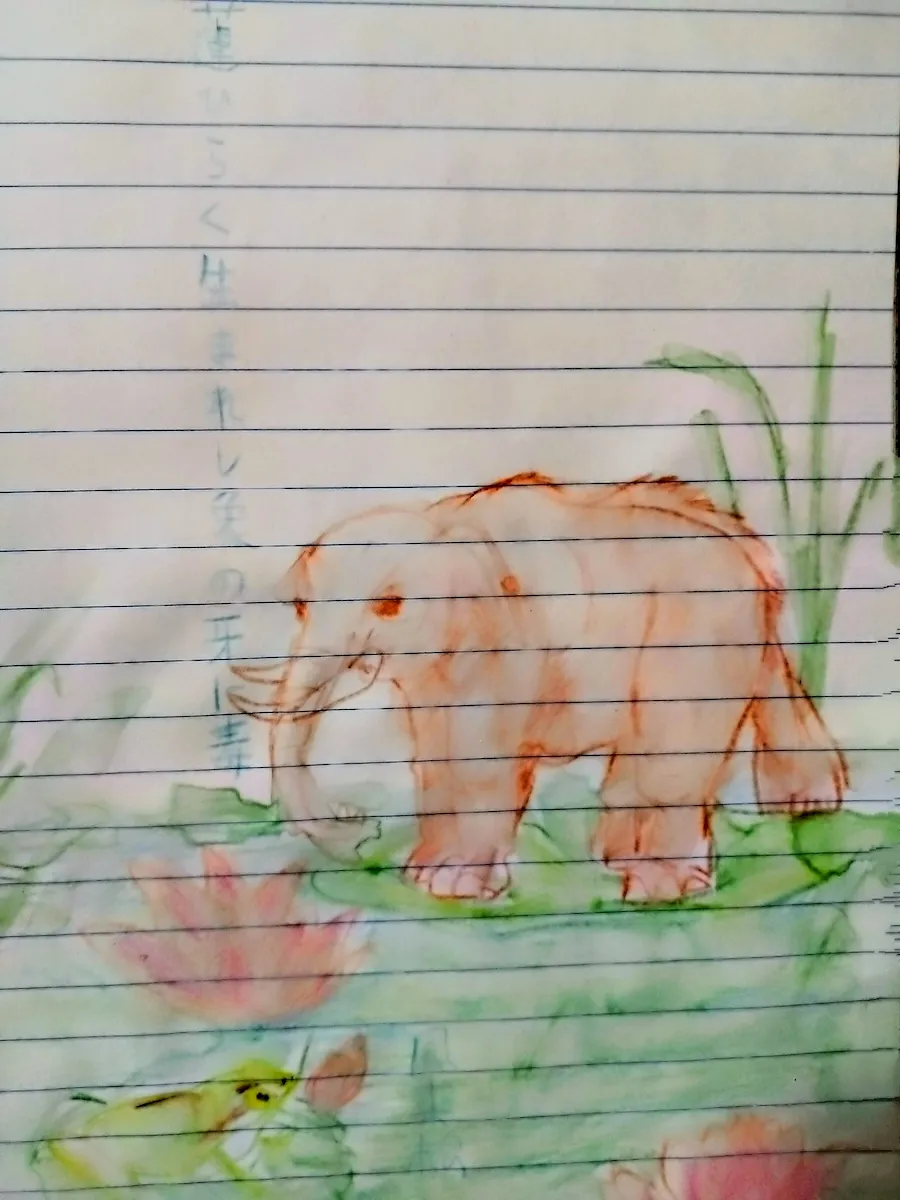 さて、絵に描いたのは、タイの小型の水性の象チャンナム。ミャンマーではイエティンインドではジャレバと呼ばれる。大きさは非常に小さく、5cmとも、1インチ(2.54cm)以下とも。魚のような尾を持ち、牙には毒がある。群れを作り水路などに棲み、そこを横切った人間が毒の為、死んでしまうこともある。陸上では生きられず、捕らえて七日で死亡した例もある。チャンナムの存在は危険から身を守ってくれると言い伝えられ、ミイラが高値で売買されている。2003年にはミイラのX線調査が行われ、その骨格は普通の象と同様だったと発表された。2007年にはマジ・ティネ軍曹が国外に持ち出し、500バーツ(10000ユーロ)で売られたという。