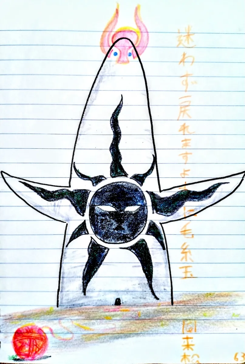 絵に描いたモチーフの一つは、『ギリシア神話』のミノタウロスの伝説。ポセイドンの呪いで、クレタのミーノース王妃パーシパエーが産んだ牛頭人身の怪物。ダイダロスによりラビリンスに閉じ込められた。毎年若い男女7人ずつの生贄を差し出されていたが、英雄テーセウスにより退治される。テーセウスはミーノース王の娘から貰った毛糸玉で、ラビリンスからも無事生還した。この伝説に、岡本太郎の〈太陽の塔〉と、同じく彼がデザインした懐かしの〈近鉄バファローズ〉のロゴも合わせてみた。岡本太郎の創作の根っこには、原初の神への祈りといったテーマがあり、その為か彼の作品はどこか妖怪めいている。