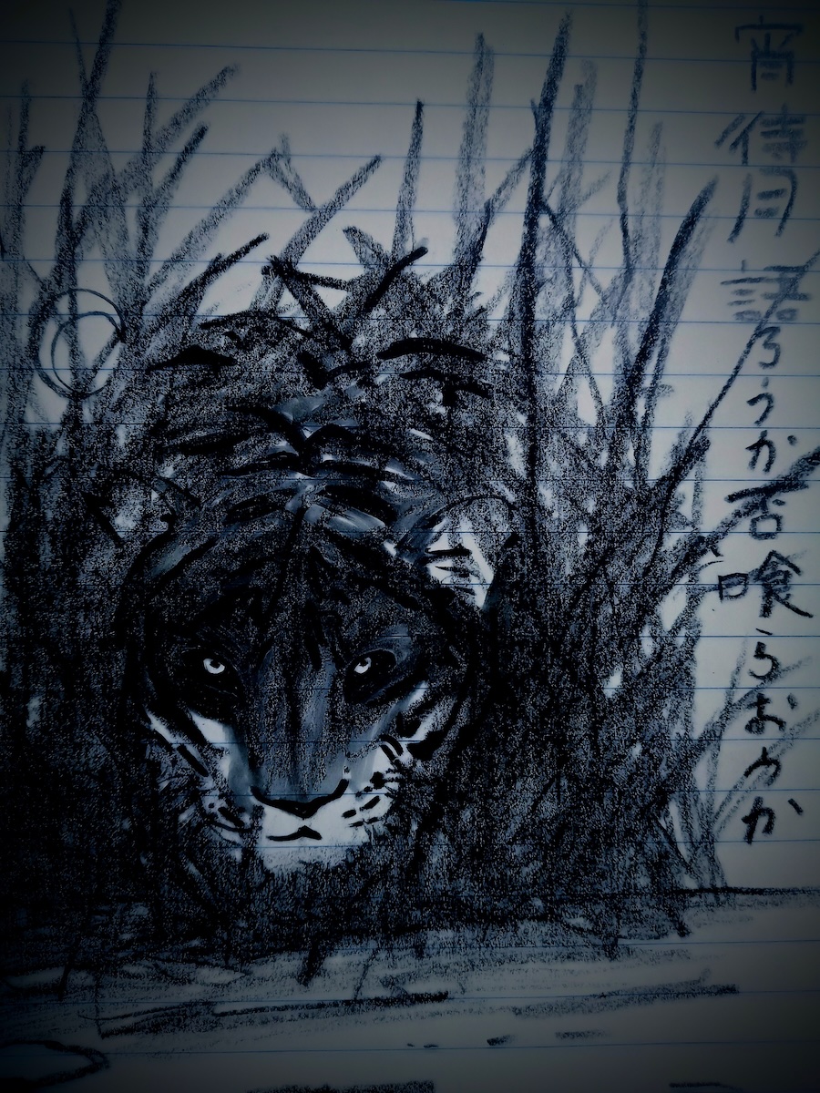 さて、絵に描いたのは、有名な中島敦の『山月記』。詩人になる夢に敗れた友人が虎になってしまう、筆者の大好きな小説だ。この話は前述の虎人から着想を得て書かれた。今、〈青空文庫〉で、同じ作者の『虎狩』も読んでみたが、これまた悪くなかった。いつか、これらの物語の登場人物たちのように、野生の虎をこの目でみてみたい。