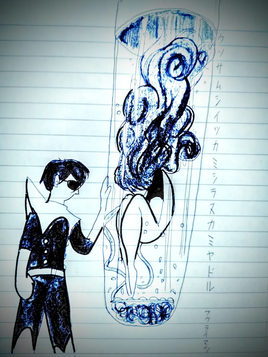 描いたのは、手塚治虫『火の鳥・未来編』の、シリウス12番の宇宙生命体・タマミと、筆者が大好きなキャラクター・ロック。この中で猿田彦博士も、人工生命体を作っていた。