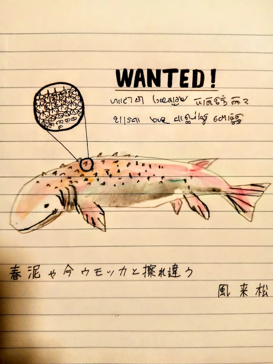 『全身、爬虫類のように硬そうなウロコにおおわれていて、色は濃い茶褐色、シーラカンスの様に、足様のヒレが前後4足付いています。大きさは1.5mくらい、(後1.8m以上と訂正)頭は魚というよりも、トカゲ? 口中には細かい歯がびっしり並び、頭の上だけウロコが無くツルッと光っていて見事に不細工。ー「これはどうするの?」と聞くと「マサラで...」やはり食うのですね。UMAカレー...。』