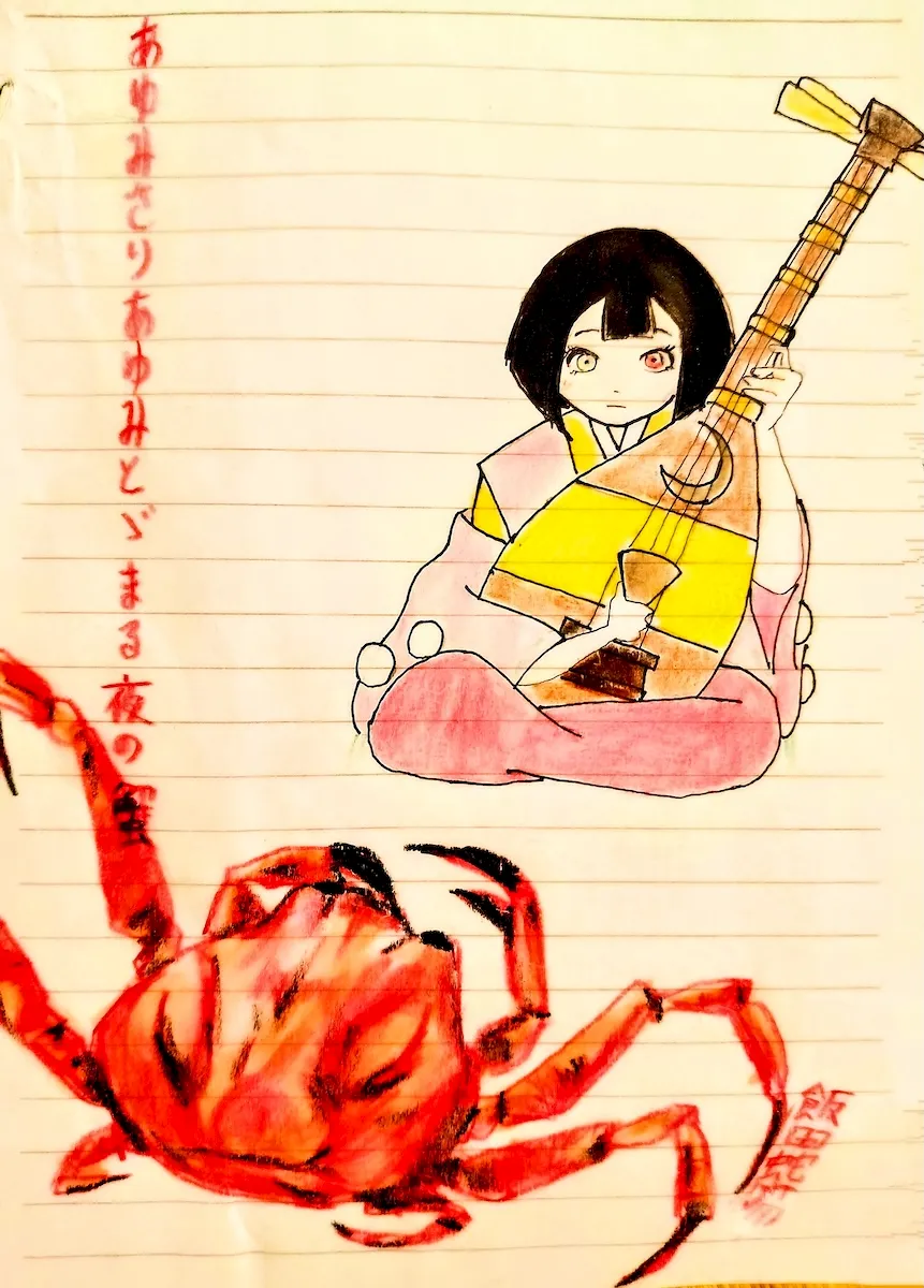 さて、描いたのは、壇ノ浦で討たれた平家の亡霊が乗り移ったと言われる〈平家蟹〉(と、アニメ『平家物語』の主人公予知眼の少女・びわ)。最期まで戦い続けた平教経がなったと言い、彼の妻海御前は河童に!『大和本草』には、平清経が化けた清経蟹が紹介されている。ある歌人が「なまじかに海鼠にならで平家蟹」と詠んだところ、夢枕に怨霊が立ち、慌てて「海鼠にもならでさすがは平家也」と詠み直したと言う。この平家蟹、不味くて食用にはならない。1952年進化生物学者ジュリアン・ハクスリーはこの模様の為食されなかった事で、ますます人に似てきたという説を発表。天文学者カール・セーガンも『コスモス』の中で取り上げた。