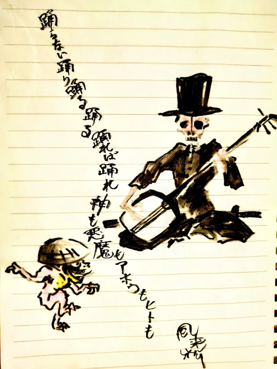 絵は、河鍋暁斎『三味線を弾く洋装の骸骨と、踊る妖怪』。