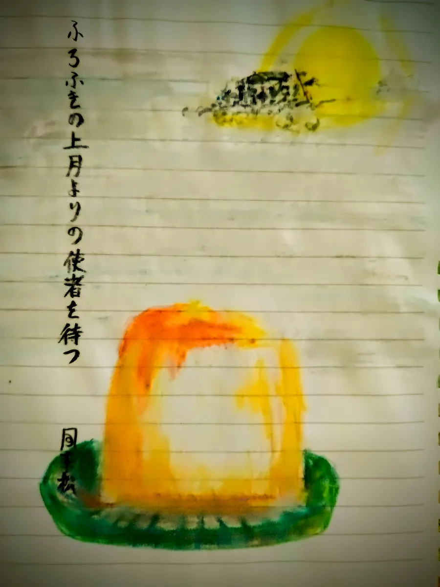 さて、描いたのは、前述の徐福が佐賀で発見したという長生不老の霊薬のカンアオイ=フロフキ(語源は不老不死!)。金立山で、仙人が釜で茹でていたという。関係ないが、同じ名前の風呂吹き大根を『未知との遭遇』のデビルズタワーぽく描いてみた。空にはかぐや姫のお迎えの月人様御一行。