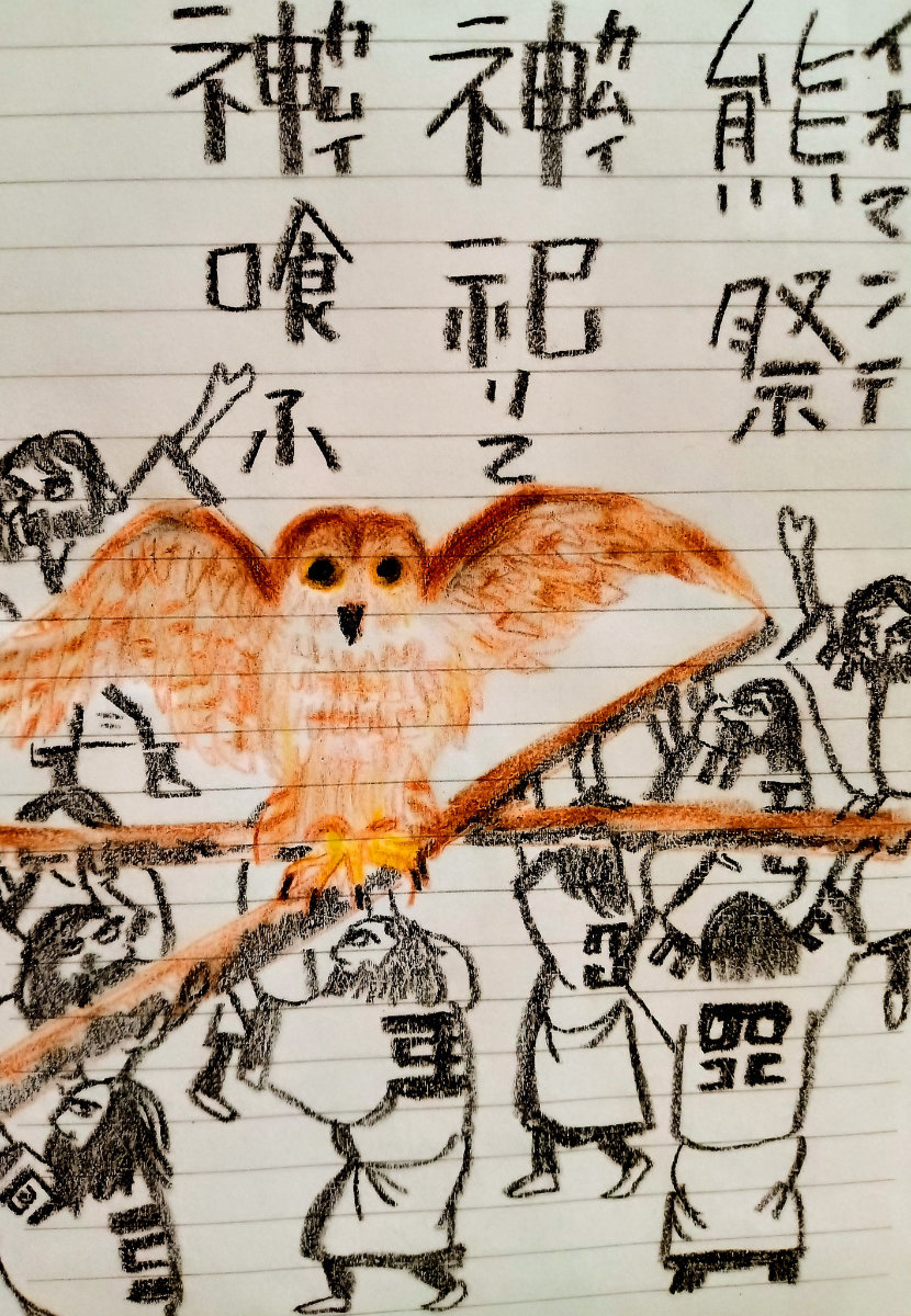 絵に描いた〈イオマンテ〉は、ヒグマ等(シマフクロウやシャチのものもある)の動物を、カムイモシリに送り返す儀式。1955年に禁止されたが、2007年撤回された。2020年の映画『アイヌモシリ』でも描かれた。