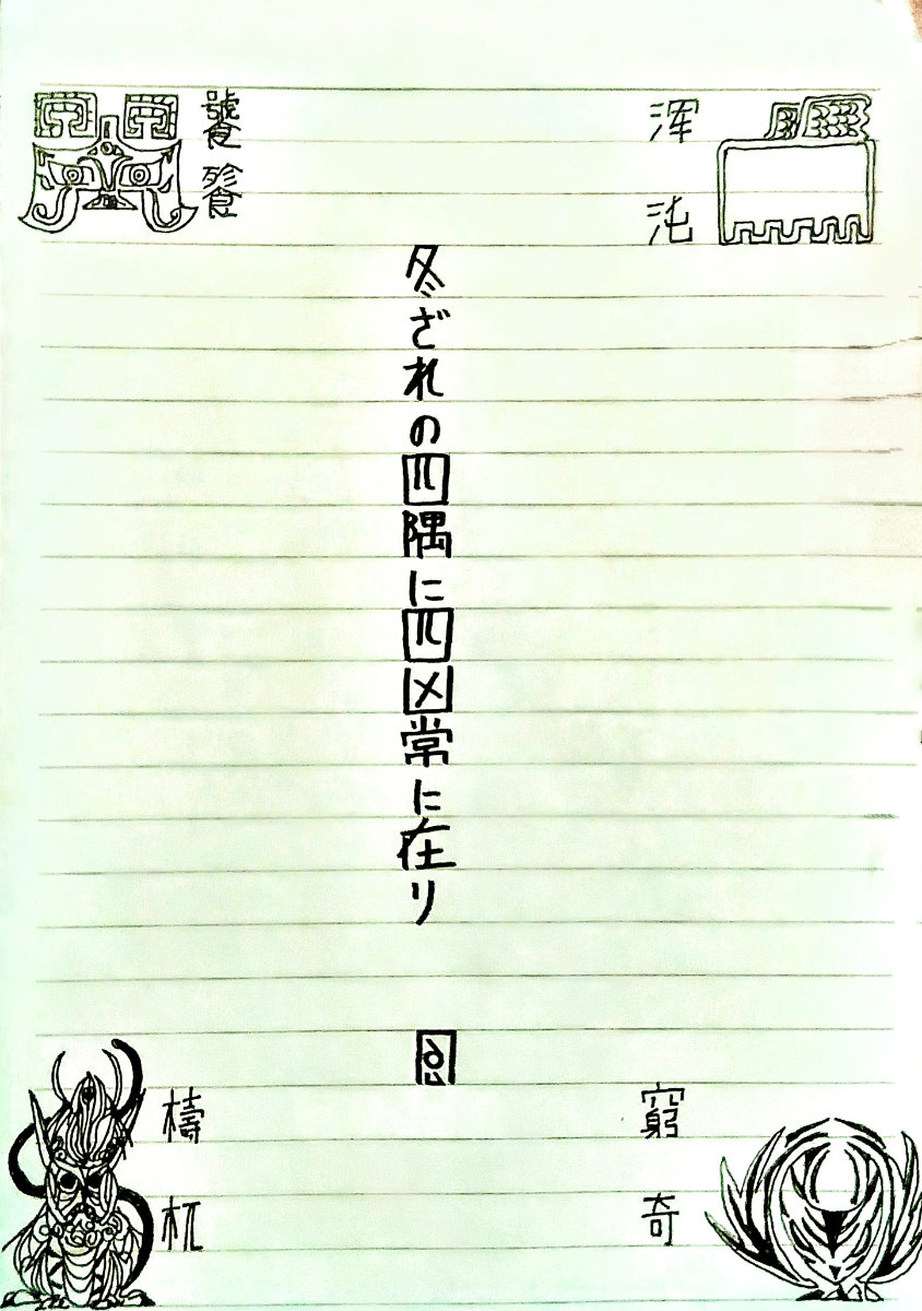 *檮杌(とうこつ)*は長い尾を持ち虎のように力強い体に、猪のような鋭い牙のある人面。無知と頑なさから、争いを好んで暴れまわり、死ぬまで戦い続ける。