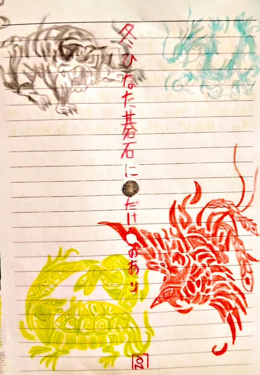 南の朱雀は、朱を基調とした五色の翼を広げた鳳凰。一説には、鶏の頭、燕の顎、蛇の首、魚の尾とも。羽虫の長。長生で、復活の象徴。フェニックスや、インドのガルーダと同一視されることも。火を操り邪を祓う。生きた虫は食べず、草も踏まない。天武帝の代に、日本の元号とされた説もある。平安時代には、その名も朱雀天皇がいた。人格名は陵光。季語では「朱夏」。西の白虎は、細長い身体の白い虎。唯一、キメラタイプではない。毛虫の長。四神の中で最高齢(最若年とも)。五百年生きた虎がこれとなる。人格名は監兵。季語は「白秋」。北原白秋もここから!