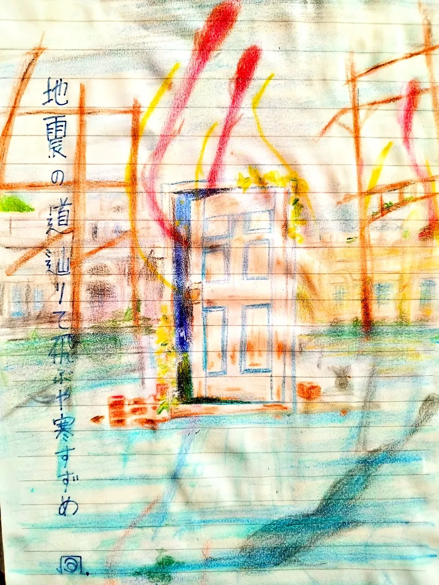 絵に描いたのは、2022年新海誠監督のアニメ映画『すずめの戸締まり』。ここではミミズと呼ばれるものが地震を起こしていた。これを観ていて思い出したのが、2017年村上春樹の短編『カエルくん、東京を救う』。ここでも、地震を起こすのがみみずくんだった...そうか、新海誠はハルキストだった! ところで、『すずめの戸締まり』に登場した地震を封じている閉じ師と似た存在が、熊本の民俗宗教にもある。その名も〈トヂ〉。女性は〈トズ〉と言い、地鎮を行う。そういえば、阿蘇には、健磐龍命がカルデラの外に溜まった水を流そうとした時に引っかかった大鯰の伝説がある。ただ、これは説得に応じて退いてくれた為、神として祀られている。筆者もかつて熊本に5年ほど住んでいて、離れた後にあの大地震が発生した。願わくは、大鯰やトヂ達の力で二度とあのような惨事がおきませんように。