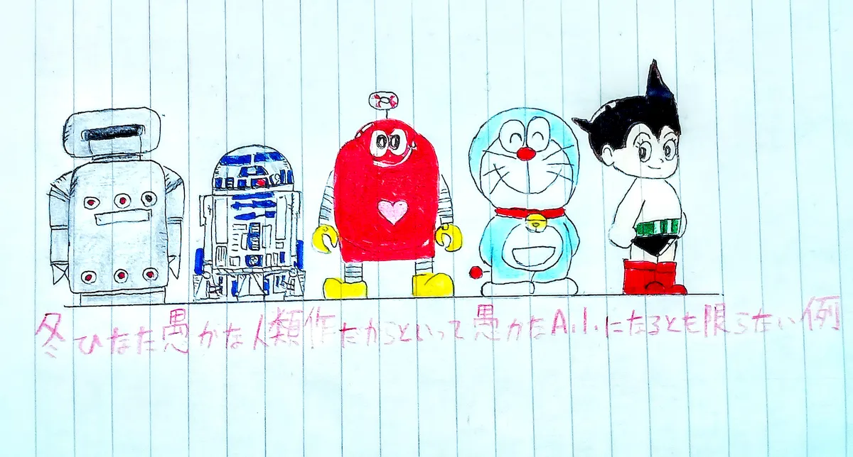 最後に、佐野元春が『鉄腕アトム』に捧げた『愚かな人類の子供だった』より...。『幼い僕は残酷だった君がアンドロイドと知るまではなぜなら僕には愛も正義もなかったから君がいなくなったとき幼い僕は泣いたさびしかったからではなくなぜなら僕は愚かな人類の子供だったから...』この詩を元に、そんな人類の作るA.I.も愚かだろうという句にしようとしたが、愛すべきA.I.達を描いているうちに変わってしまった...!