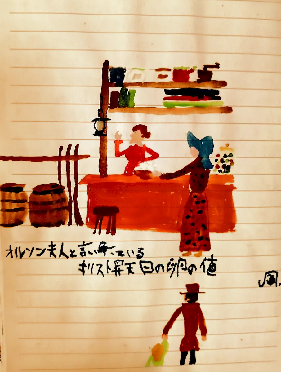 句は、上記の事を元に捻ってみた。絵は安野光雅監修の『小さな家のローラ』から。子供の頃『大草原の小さな家』をいつも見ていた。「オルソン夫人て、ほんとケチ!」「ローラ、人の悪口を言うのはよしなさい。」「ごめんなさい、父さん...でも...」「まぁ、確かにオルソン夫人はちょっとガメついところはあるな。」「!」キャロライン母さんが卵を売りに行くシーンは、記憶に残っている。