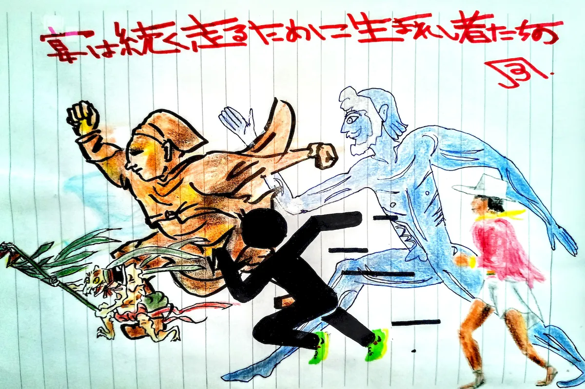 毎月参加させて貰っている〈伊予本プロジェクト〉の読書会で紹介された、クリストファー・マクドゥーガル著『BORN TO RUN』を読んだ。世界一足が速いと言われるメキシコのチワワ州の〈タラウマラ族〉について書かれている。老若男女、自家製サンダル履き、山岳地帯を強靭な脚力と持久力で走り回る。別名「走る民族」! 彼らの伝承には、チュウイなる悪い妖怪がいて、四つん這いで走り回り、家畜の羊を殺し、人の顔をつばを吐くという。また、死者の魂は生前、肉体が残した足跡や髪の毛を回収する為、人の目に見えない程の速さで奔走する。