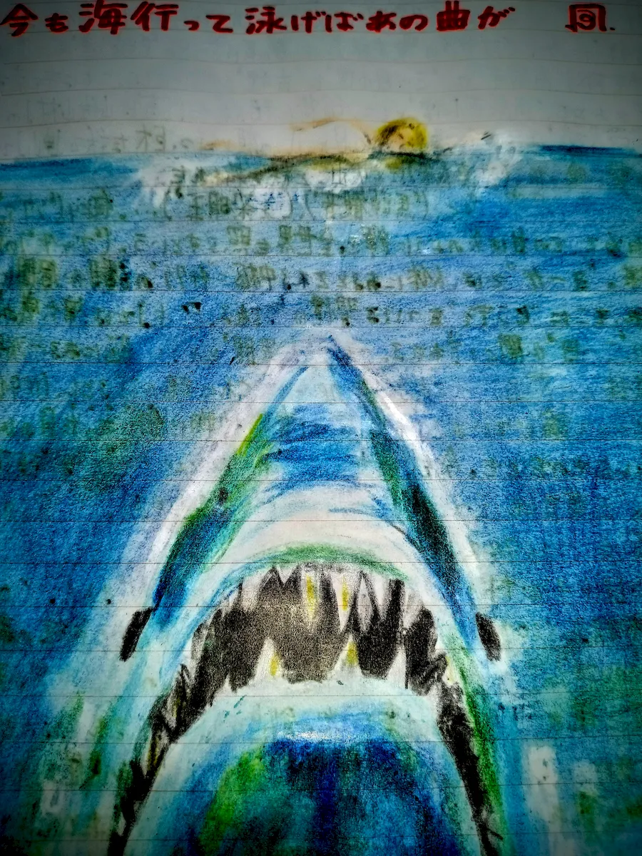 描いたのは、勿論サメ映画の金字塔、スピルバーグの出世作『ジョーズ』。鮫の見せ方、サスペンスフルな展開、魅力的な登場人物、そしてジョンウィリアムズのテーマ曲! 筆者のベスト1候補である。その後も正当、亜流含め今に至るまで数数のサメ映画が作られ続けている。今年も『温泉シャーク』なるC級邦画が公開される...。