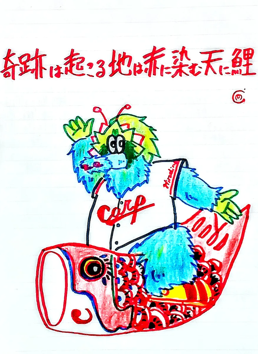 さて、絵に描いたのは、〈カープ〉のマスコット〈スラィリー〉。1995年の中日戦で、突如登場! その正体も、なぜ誕生したのかも謎?! あの『セサミストリート』の会社のデザインで、メジャー球団〈フィリーズ〉の〈ファナティック〉とは従兄弟らしい...。句の方は、2016年の25年ぶりのリーグ優勝を思い出して...。その瞬間、〈旧広島市民球場〉にいたのだが、あれ程の歓喜の渦というのは、これまでの人生で経験した事がなかったし、おそらくこの先も、もうないと思った...。だがしかし! その後、まさかの三連覇!〈バチカン〉に奇跡認定してもらいたいの〜!