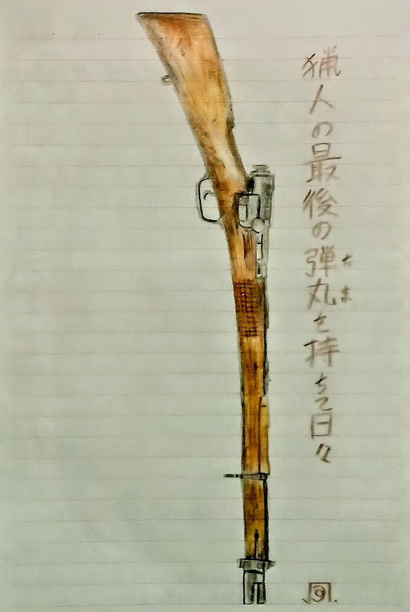 絵に描いたのは、〈村田銃〉。薩摩藩の村田経芳が、フランスの〈グラース銃〉を元に開発した初の国産小銃だ。戦後、払い下げられ猟銃として使用された。これまで、さんざ嬉々として銃についても書き連ねたにもかかわらず、やはり兵器という人殺しの道具は、描いていて気持ちの良いものではないと感じた。一方で、銃にしろ、刀にしろ、あるいは戦車・戦闘機・戦艦…はたまた、SFやマンガに登場するロボット兵器…そんな物にどうしても惹かれてしまうというのは、何なのだろう。人間としての本能なのか…。軍事マニアとして知られる宮崎駿も「僕は政治的には再軍備も反対だったし、未だにPKOにも反対な人間なんですけれど、軍事的なことについては一貫して興味を持っている人間なんですね。」と発言している。宮崎の『宮崎駿の雑想ノート』には、古今東西の兵器と人の織りなす狂気の情熱が描かれている。ここから『紅の豚』や、『風立ちぬ』も生まれた。