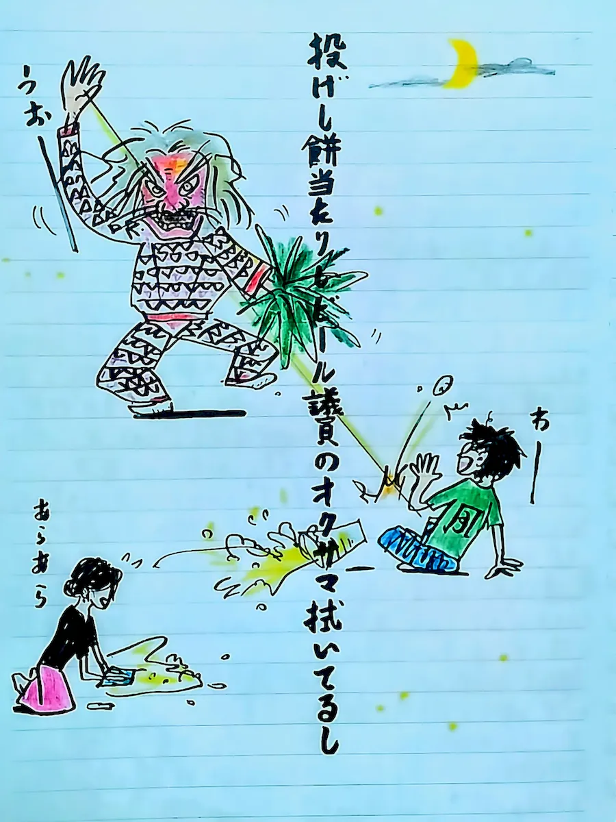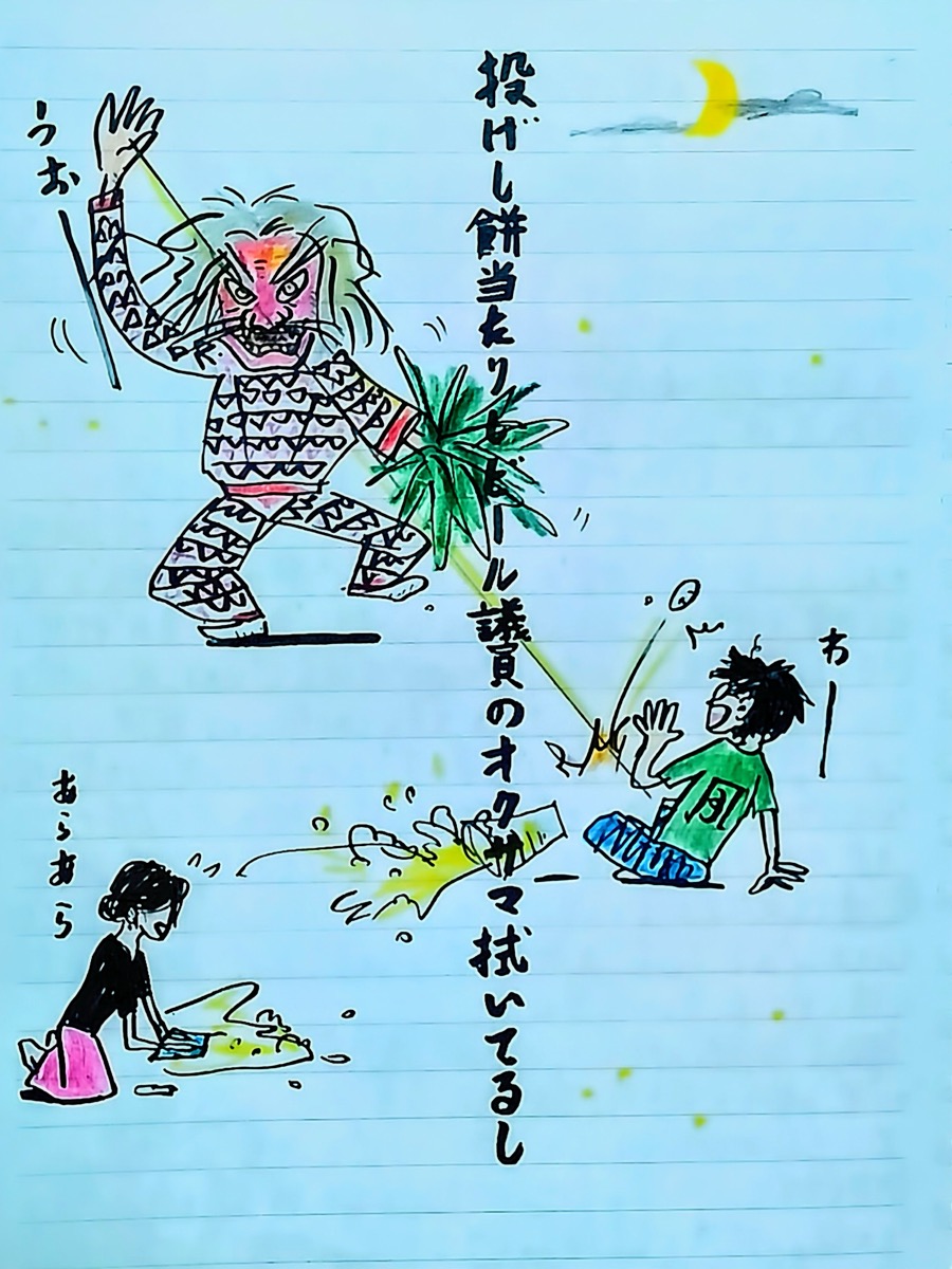 この提婆達多、そしてだいばの王…何処かで聞き覚えがある…と、思い当たったのが愛媛県大洲市柳沢の〈藤縄神楽〉で見たダイバンだった! 鬼のような姿で舞い、餅を投げたり、赤子を抱いたりしていた(絵と句はその時の様子を詠んだ)。全国の神楽、秋祭、どろんこ祭りなんかにも、これと良く似た鬼が登場し、ダイバ・ダイバン等と呼ばれる。牛鬼祭りでも先導役。群馬の馬を害する妖怪や、長野にも同様の名前の妖怪がいる。また、このダイバは、猿田彦とも同一視される(猿田彦についてはまた改めて書く事とする)。
