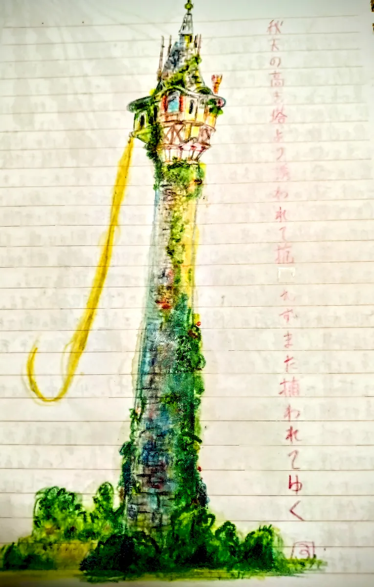 絵に描いたのはのは、ディズニーでもアニメ映画化された、『塔の上のラプンツェル』。元々は民話をグリム兄弟がソフトに改変したものだ。では、改変前はというと…。〈ラプンツェル〉というのは、妊婦に良いとされる植物ノチシャの事。ある女が、これを魔法使いの敷地から盗み取り、その代償として差し出されたのが、生まれた赤子ラプンツェル。彼女は魔法使いに塔に閉じ込められたまま成長する。そして、ある時王子と出会い、その長い髪で彼を招き入れる。やがて、逢瀬を重ねる内に二人の間に子ができる。その事が魔法使いにばれ、ラプンツェルは荒野に追放、その事を知った王子は塔より身を投げる。一命はとりとめたが、茨に両目を貫かれ失明してしまった…。だが、しかし! それから7年後…なんと、森をさまよい続けた王子は、荒野で双子を育てていたラプンツェルと再会! 彼女の流した涙で、王子の目も治り、2人は国へ戻って幸せに暮らしましたとさ。よもや、よもやの、大逆転パッピーエンド…!