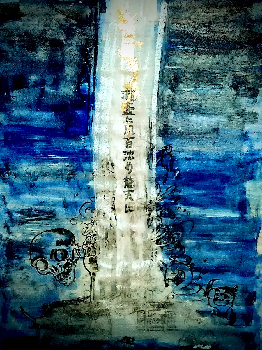 さて、絵は、滝の画家・千住博風の滝の中に、今回出てきたいろいろなものを描いてみた。巨大な髑髏は、平将門の娘・瀧夜叉姫が丑の刻参りで、貴船の荒神または蝦蟇仙人・肉芝仙に妖術を授かり成った姿。歌川国芳が描いた浮世絵をモデルに、水木サンががしゃ髑髏と名付けた。その後、姫は奥州で庵を結び、地蔵菩薩を信仰して八十歳まで生きたという。