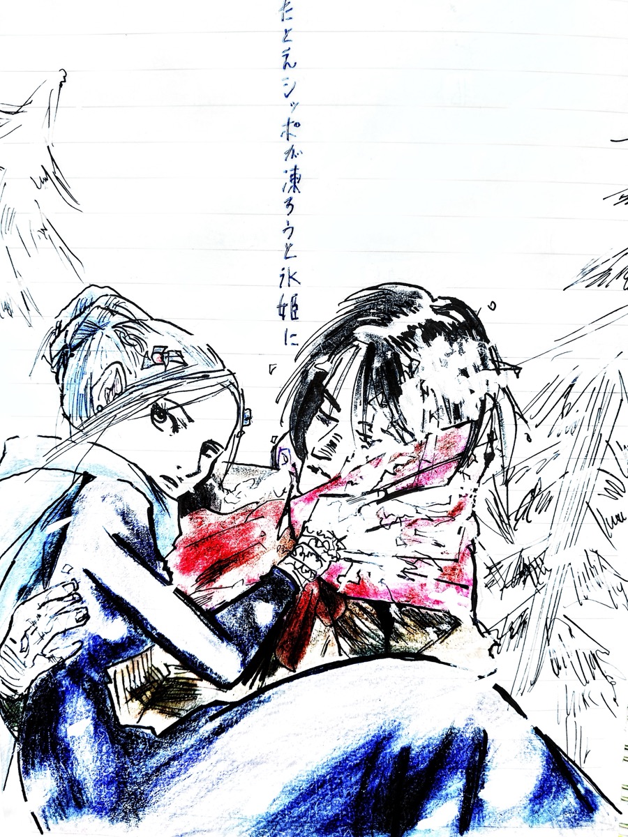 さて、絵に描いたのは氷姫。モデルは、沙村広明『春風のスネグラチカ』(スネグラチカは雪娘だが)。トーベ・ヤンソンの『ムーミン谷の冬』の氷姫は、見る者すべてを凍らせてしまう。句は、彼女を見て凍ってしまったリスの話から。一方、ハンス・アンデルセンにも『氷姫』がある。子供の頃に氷河に落ちた男が氷姫に目をつけられ、大人になり結婚式の日に、湖の中に連れ去られてしまうという恐ろしい話。元ネタは、スイス・レマン湖ベイルツ島の伝説。といえば、あのナルシスが、湖に映った自分に口づけしようとして溺れ死んだ? もしや、これも氷姫の仕業?