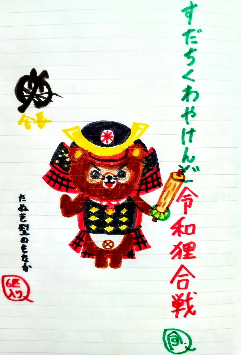 小松島の駅におりると、小さな駅舎に似つかわしくない立派な観光ブースが! そこの案内のおばちゃんに「この先に世界一の大きさの狸の像があるでないで。その前で手を叩いてみてね。」と教わり、早速行ってみたところ、あった、あった、巨大な像が(5m5t)! 言われた通り手を叩いてみると、像の背後の青石から滝よのうな水が! そうか、この地は水が豊富なのか(筆者の住む松山は、四六時中、水不足に喘いでいる)。この先の公園にも、沢山の狸の像があった。絵に描いたのは、そこで土産に買った『狸合戦最中』の包み。ご当地キャラ〈こまポン〉のデザインには、名物の〈すだちちくわ〉と、源義経の伝説も取り入れられている。