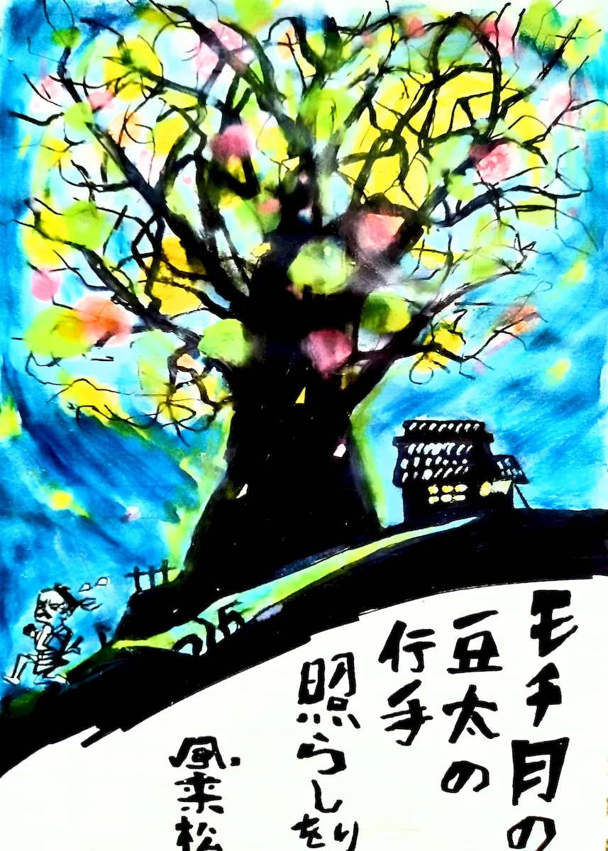 描いたのは、今も小学校の教科書にある斎藤隆介作・滝平二郎絵の『モチモチの木』。弱虫の主人公豆太は倒れた祖父の為、医者を呼びに半里離れた麓の村へ夜道を走る。その時、いつも恐れていたモチモチの木(トチ)が光る。『勇気のあるものだけが見られる山の神の祭』と祖父から聞いていたのが、これだった。しかし、その後豆太が元の弱虫にもどってしまうのが、可笑しい!