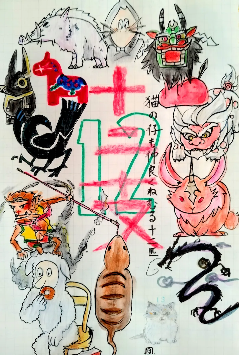 さて、最後に12という数に触れたい。なぜ十二支としたかについては、木星が太陽の周りを周る周期、同じように月が約12年で地球を周る為…等と言われる。干支に限らず、世界中に12はあふれている。時間、星座、キリスト教の聖人、『ギリシャ神話』の神、陪審員…。元々は、イギリスでは12進法を採用していた。1ダースは12。英語も、12まではきちんとした(?)単語がつけられている(13からは〜teen)。1フィート=12インチ。1シリング=12ペンス。12は、なにより並べやすいし、分けやすいので、昔から争いが起きない平和な数だったようだ。