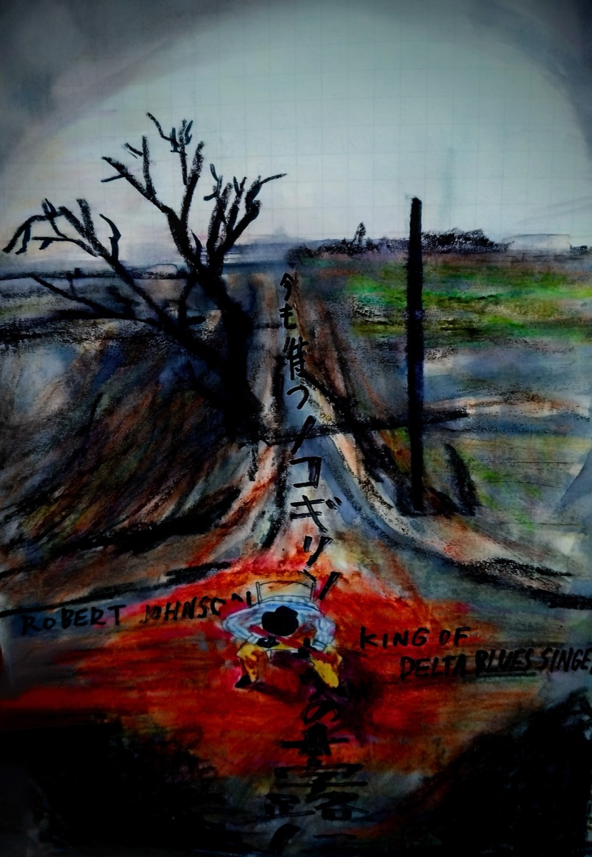 さて、最後にクロスロードの伝説をもう少し。そこへ、深夜0時ちょっと前に行き、一人でギターをひとくさり弾く。すると、黒い大男が現れて、ギターを取り上げチューニングをする。そうすると、何でも弾けるようになる…!