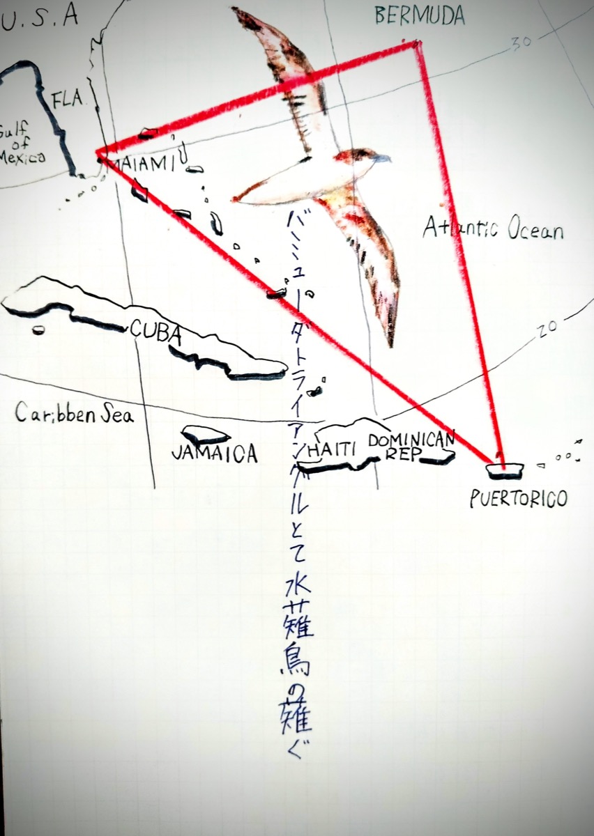 さて、最後にバミューダ諸島について。イギリス領のこの島々は、実は一人当たりのGDPが世界1位になったこともある、金融と観光の土地だ。1500年、島を発見したスペインの探検家ファン・デ・ベルムーデスにちなんで命名された。その当時も、その100年後イギリス人が入植した時も、島には誰も住んでいなかった! というのも、この辺りは頻繁に嵐に見舞われ、危険な岩礁も多く、何より島は悪魔や精霊の不気味な声に包まれ、「悪魔の島」と呼ばれていたからであった! 何のことはない。ここは人々がバミューダトライアングルと名付ける前から、いわく付きの島だったのだ…! さて、句に詠んで絵に描いたのが、その悪魔の声の正体〈バミューダミズナギドリ〉。この悪魔とて人が住み始めると食料として乱獲され、絶滅の危機に陥るのだが。
