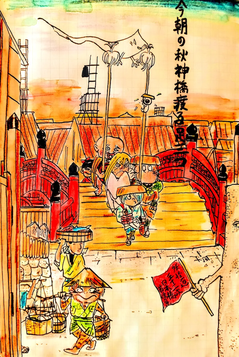 絵に描いたのは、〈日本橋〉。1603年に造られた。大江戸の中心で五街道の起点。この橋、幕末までに10回も焼け落ちている。現在の2連アーチ橋は、なんと20代目! 銘板は徳川慶喜による揮毫で、麒麟の像は東京の繁栄を表す。