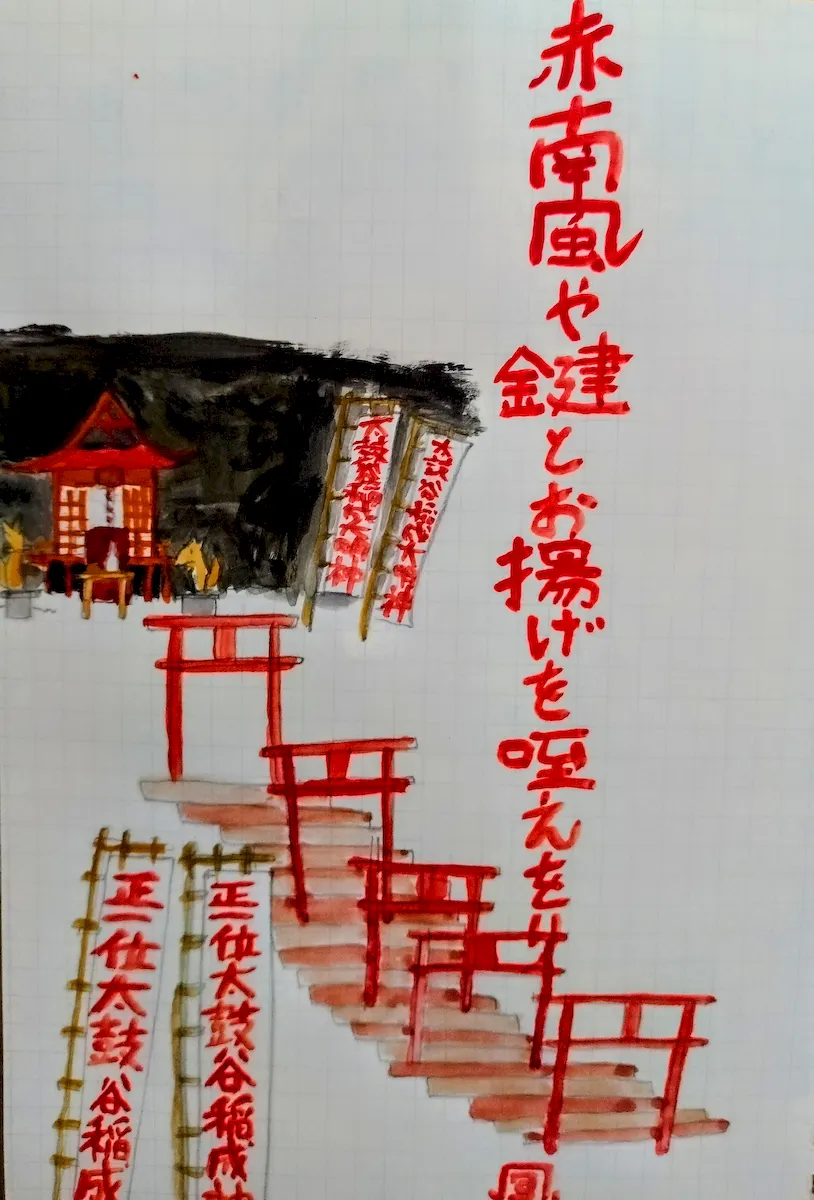 夏休み、周防大島から〈SL山口号〉で島根の津和野まで足を伸ばした。人々は上品で、変に観光地化されていない、とても居心地の良い土地だった。400年の歴史を持つ盆踊り〈津和野踊り〉を見物したり、名城として名高い〈津和野城跡〉も訪れた。その城へのリフトの登り口にあるのが、〈太鼓谷稲成神社〉。