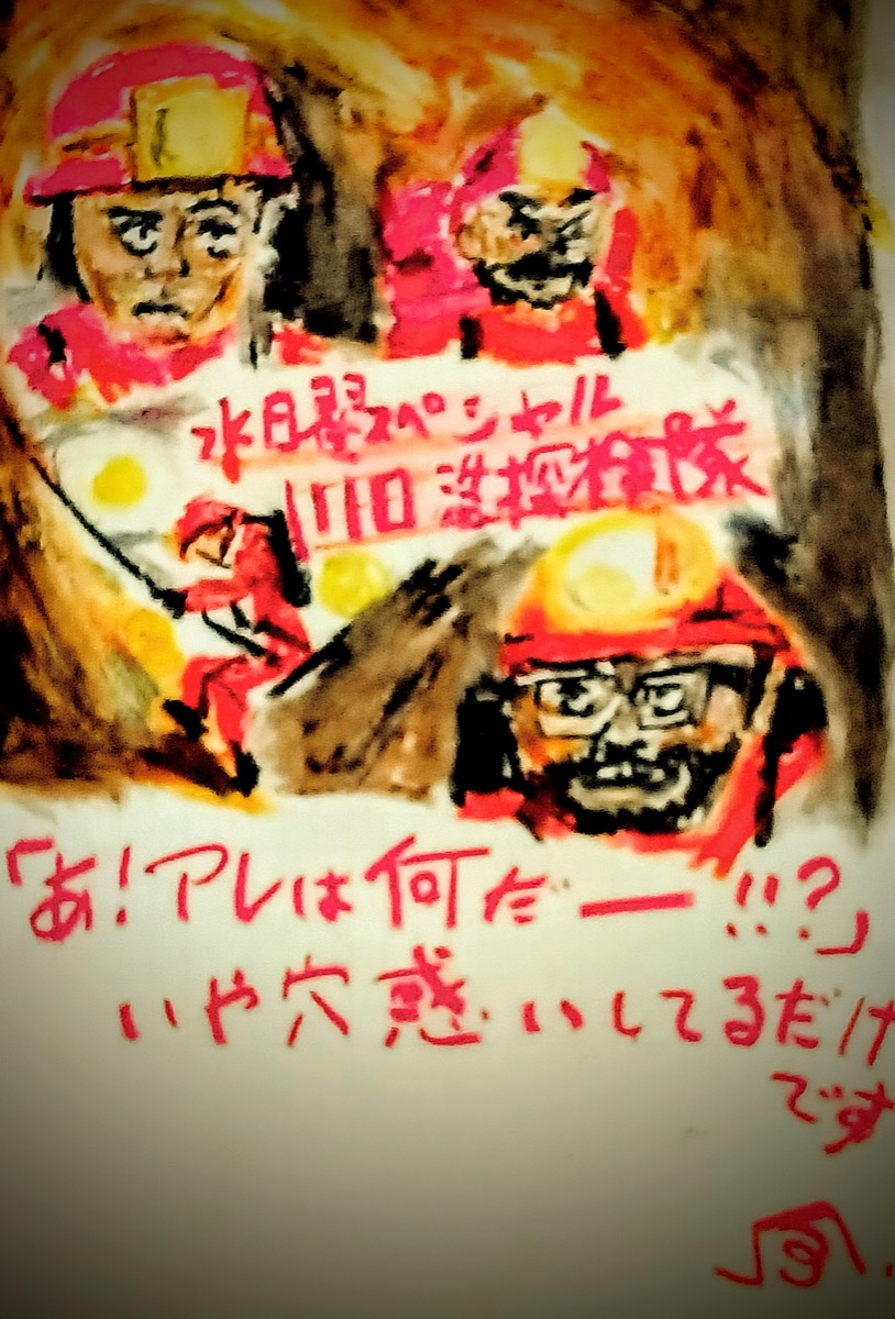 さて、絵に描いたのは子供の頃テレビでやっていた『水曜スペシャル・川口浩探検隊』である。よく洞窟を探検しては、CMの前に「あ! あれは何だー!?」と煽りつつも、たいしたことは何も起きないというお決まりが笑えた。双頭の蛇や大蛇も出てきたりして、最後は海に抜けるというパターン。後に観た『グーニーズ』も似たような展開だったが、洞窟を抜けて海が広がっている光景というのは、なぜだか感動してしまうんだよな〜…。