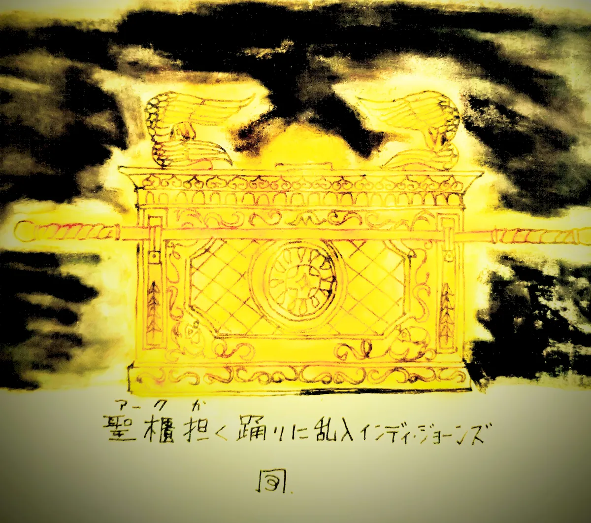 さて、聖櫃(アーク)。モーゼが神の啓示をうけて制作し、〈出エジプト〉の一年後には完成していたという。その形状は『旧約聖書/出エジプト記』に詳細に記されている。箱はアカシアの木で作られ、純金で覆われている。上部には二体のケルビム(智天使)像。